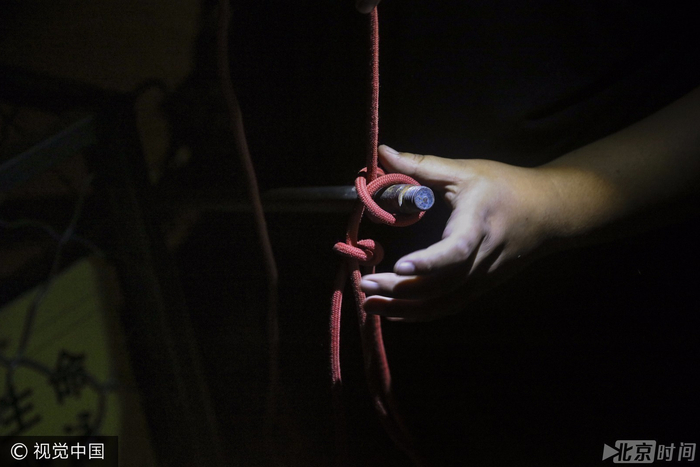 最开始参与到这项工作时,天华难免也有一些心理波动,在经历了这么多次之后,他的心态已经很平稳了。“我们打捞用的那根绳子,最开始的时候,每次捞人上来之后就剪一段,后来时间久了也不剪了,也没在意了。”最近一周天华连续参与了三起溺亡打捞,每年绿舟救援队参与的溺亡打捞有30多起,近40具尸体,有时他们会在车上带一块“请勿野泳”的警示牌插在溺亡现场,但这种警示似乎收效甚微。图为救援队员给打捞工具打绳结。