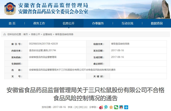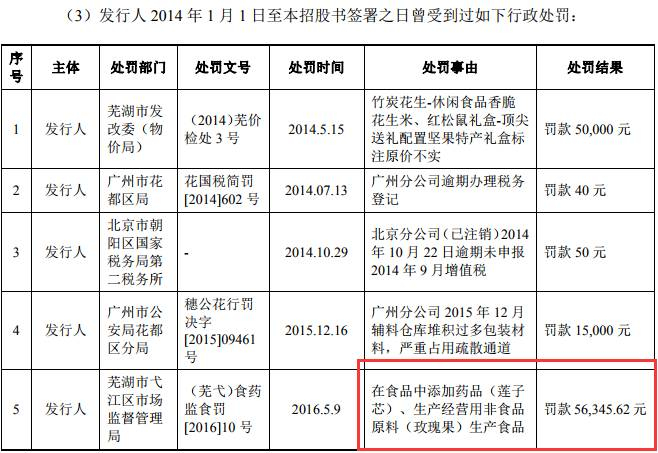 此外,上述招股说明书(申报稿)还显示,2016年5月三只松鼠曾因在食品中添加药品(莲子芯)、生产经营用非食品原料(玫瑰果)生产食品被芜湖市弋江区市场监督管理局罚款5.6万元。