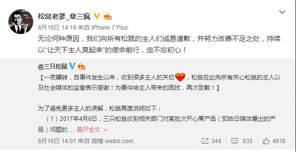 ▲章燎原在其微博上转发了三只松鼠的相关声明