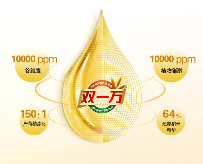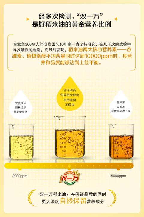 二流的企业做产品,一流的企业做标准。从2006年稻米油立项开始,金龙鱼10年科研投入,经上千次实验,终于不负众望,在不损失品质的前提下,突破性研发出谷维素和植物甾醇平均含量同时达到10000ppm的稻米油,被业界称为“双一万”。
