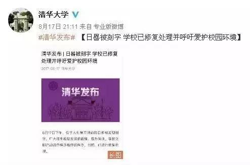 昨天晚上,清华大学通过官微谴责这种不文明行为,提出美丽校园需要持续建设,校园文化需要精心呵护。我们呼吁师生员工和社会各界人士共同爱护校园环境。学校也将进一步加大校园管理和保护,一旦查到任何破坏校园文物、景观、设施、环境等行为,将按照法律法规和相应规定严肃处理。