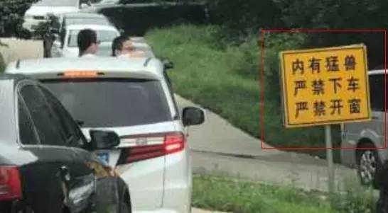 这辆车旁边的警示牌写着什么呢?——“内有猛兽,严禁下车,严禁开窗。”