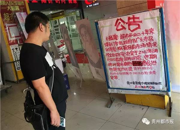 贵阳市解放路大昌隆超市的正门口,立着一个红色字体的公告牌,上面明确的写着:公司决定于2017年8月18日大昌隆超市闭店。