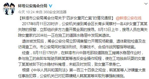 今天上午10:24,蚌埠市公安官方微博@蚌埠公安在线 发布【蚌埠市公安局禹会分局关于“四岁女童死亡案”的情况通报】: