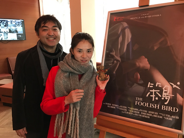 导演大冢龙治(左)、主演姚红贵与《笨鸟》电影海报