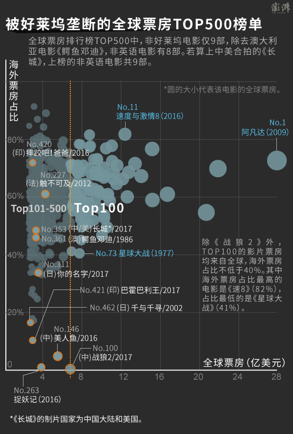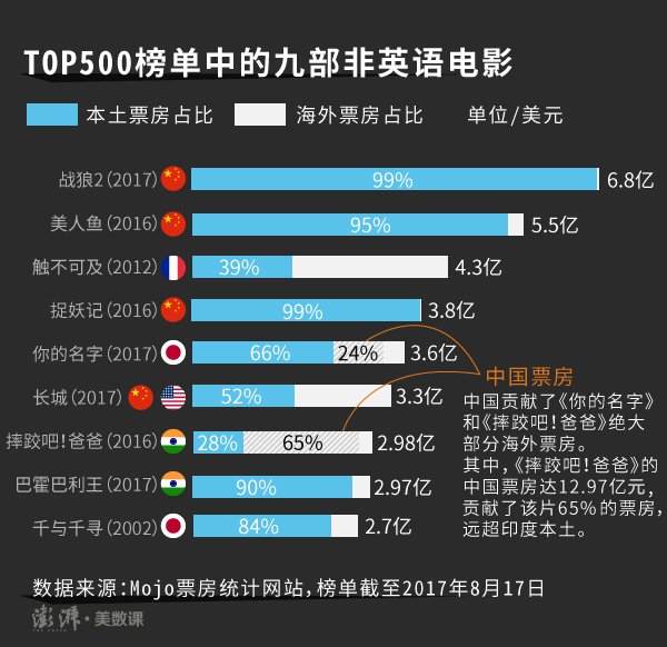 全球票房TOP500榜单中的非好莱坞电影也仅有9部:三部中国电影(《战狼2》、《美人鱼》和《捉妖记》),一部法国电影(《触不可及》),两部日本电影(《你的名字》和《千与千寻》),两部印度电影(《摔跤吧!爸爸》和《巴霍巴利王》)和一部澳大利亚电影(《鳄鱼邓迪》)。除去澳大利亚电影《鳄鱼邓迪》,非英语电影有8部,如果再算上张艺谋的《长城》(中美合拍),TOP500榜单中的非英语电影也是9部。
