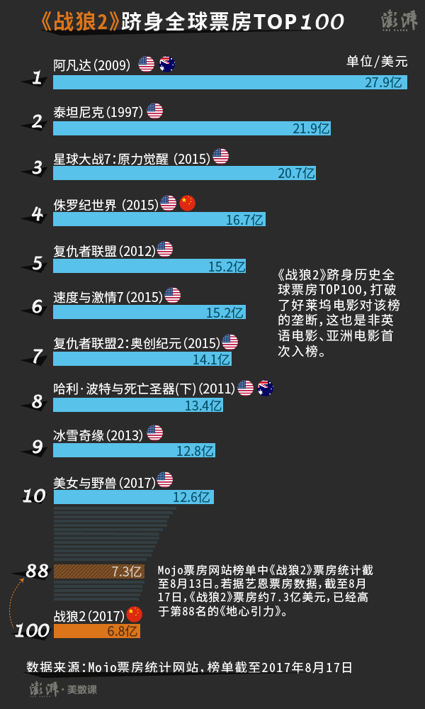 另外,票房网站Mojo对《战狼2》的数据统计截至8月13日,如果按艺恩票房统计,截至8月17日下午5点,电影《战狼2》国内累计票房已达48.5亿,约7.3亿美元,已经高于第88名的《地心引力》。随着《战狼2》的持续上映,它的排名还可能继续上升。