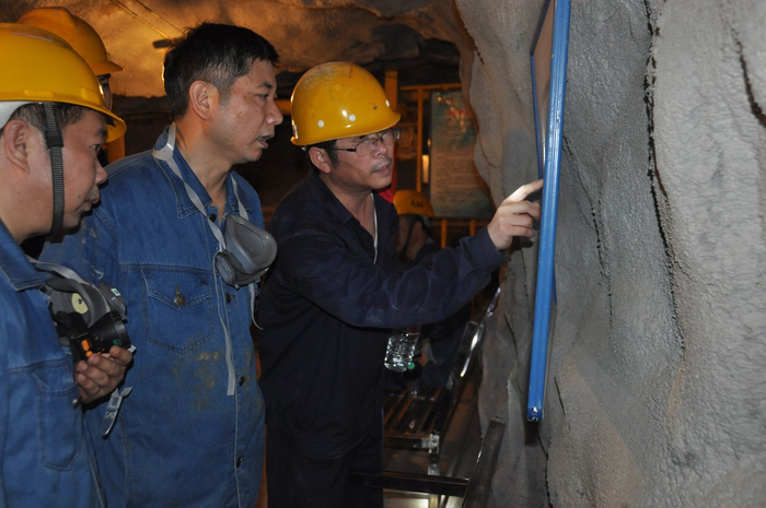 湖南黄金股份有限公司总经理陈建权(中)、副总经理崔文(左)与黄金洞矿业领导在井下生产现场检查指导工作。