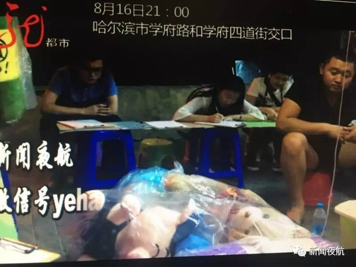 在哈尔滨学府路和学府四道街交口处,有一片夜市。一名男子在这里支了一个小摊位,挂起一个条幅。上面写着:从1写到600,公仔免费拿。