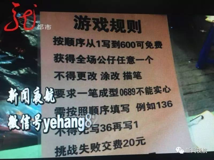 男子摆了一圈桌椅,上面有纸和笔。纸画好了格,一张纸正好六百个格,只要按要求从1写到600,就能随意选择一个公仔玩具。要求就是0 1 2 3一笔,6 7 8 9一笔,4 5两笔。
