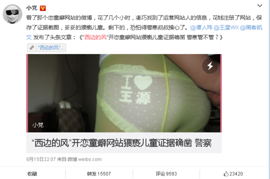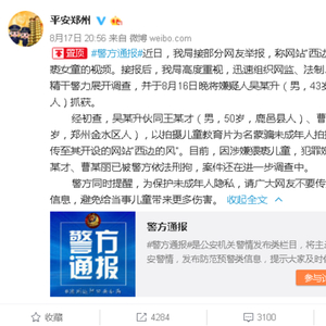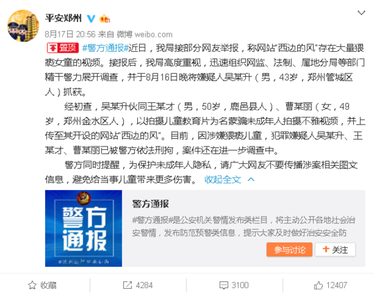 8月16日,@郑州网警巡查执法 微博通报:接网友举报,网站“西边的风”(www.xbdf.me)存在大量猥亵女童的视频,目前郑州警方已就此事件展开调查。欢迎大家继续提供线索。