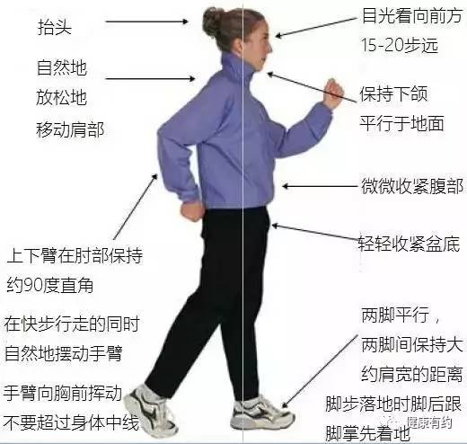 二是双手微微握拳、手肘弯曲约90度,肩膀前后摆动幅度不要超过耳朵,手臂自然前后摆动带动步伐;