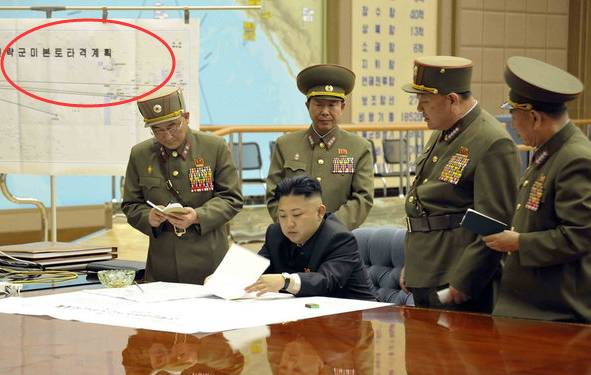 三天前,朝鲜最高领袖金正恩视察战略军司令部,官方发布的照片里赫然出现联令韩国紧张的内容,一张挂在墙上的地图赫然标明“南朝鲜作战地带”字样,三条界线清晰地标出朝鲜战略军所辖导弹对韩国国土的覆盖范围。这是继2013年3月之后,朝鲜再度通过发布金正恩照片来“意外泄密”作战计划,上一次照片中出现了显示朝鲜远程导弹打击美国本土的作战地图。专家认为,“照片示威”可被解读为朝鲜拉开与美韩全面军事对决的架势。