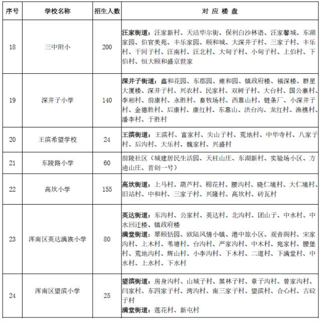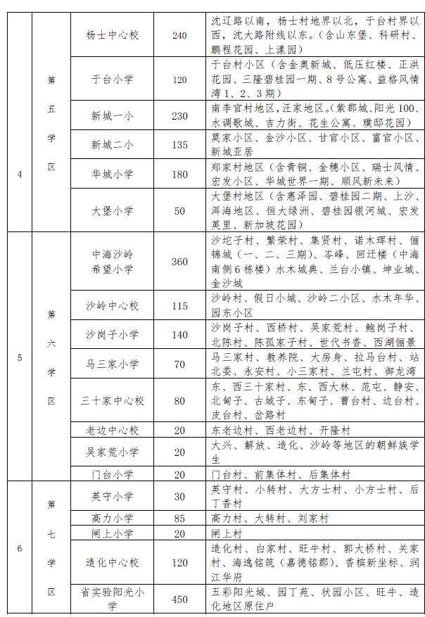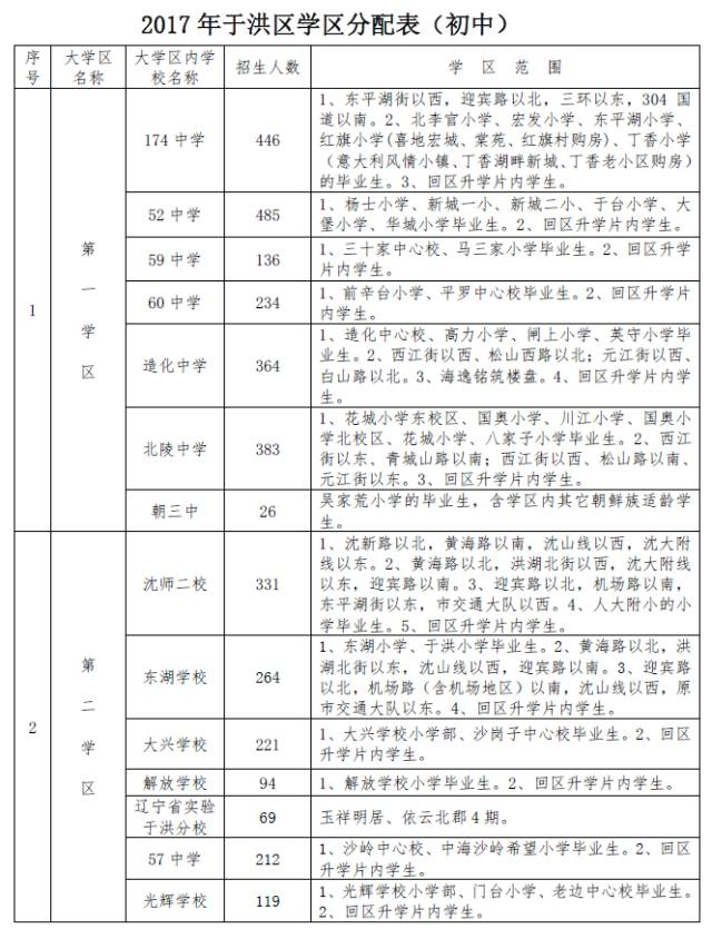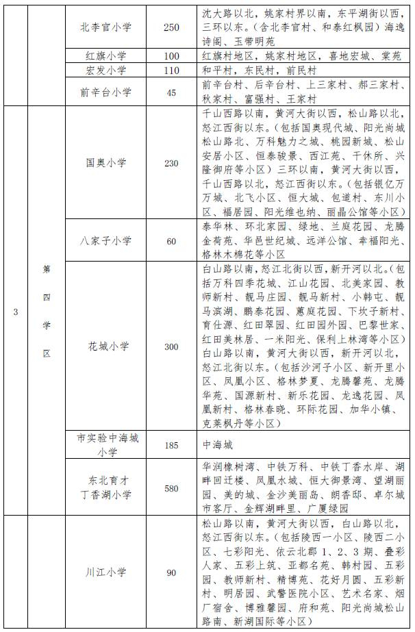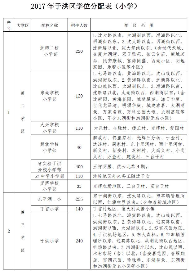 小学:由于迎宾路地区、于洪新城地区学额增多,今年学区划分有调整。迎宾路地区东湖秀景、东湖街和洪湖街无名小区等学区由东湖学校调整到于洪小学。于洪新城地区益格风情湾一、二、三期学区由华城学校调整到于台小学。新建楼盘璞邸花园划入于洪新城第一小学;润江华府、香槟新坐标划入造化小学;宝能水岸康城划入平罗小学。
