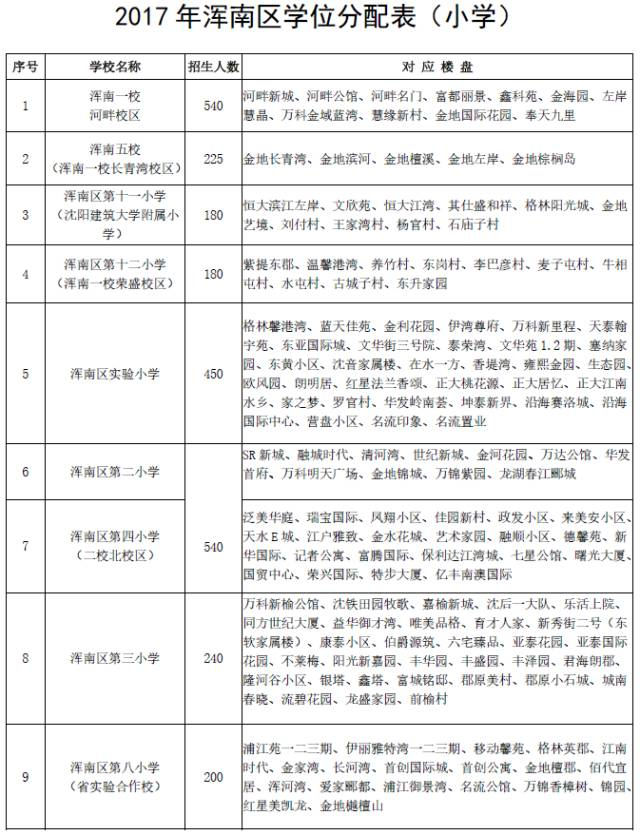 浑南区学区划分对应楼盘,而非社区。今年新增4所小学和1所初中。分别是浑南区第八小学(省实验合作校)、浑南区第九小学(沈阳市教育研究院附属小学)、浑南区第十一小学(沈阳建筑大学附属小学)和浑南区第十二小学(浑南一校荣盛校区)。初中新增浑南区第五初级中学。