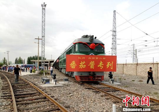 中新网乌鲁木齐8月18日电 (王波 陈琼)18日12时,满载着2885吨番茄酱的专列从新疆焉耆站发车,向天津港驶去,这是新疆开行的首趟番茄酱专列出疆。