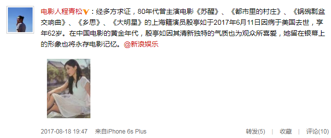 据知名电影人程青松微博消息,演员殷亭如于2017年6月11日因病于美国去世,享年62岁。