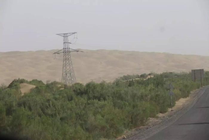 我们所行进的这条公路于1993年动工,施工人员所面对的这片沙漠,年平均降水量24.6毫米。年蒸发量3638.6mm,是降水量的接近330倍。每年风沙天130天,四五级风司空见惯,偶尔也有八九级大风毁屋拔树的来亲近一番。