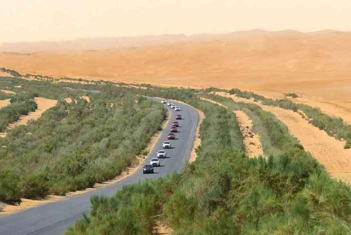 就这样摸着沙漠的“脾气”,研究着沙漠的“套路”,沿着公路建设起了全长436公里、宽70多米的沙漠公路绿化带,把两千多万株生命带进了沙漠。