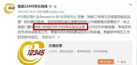 记者了解到,此前昆明12345市长热线官方微博在回应网友“地铁三号线九月底是否能试运营”问题时,昆明轨道交通集团有限公司的回复是,按上级部门要求地铁3号线在9月30日前实现试运营,公司正在积极准备,争取在时间节点完成各项工作。
