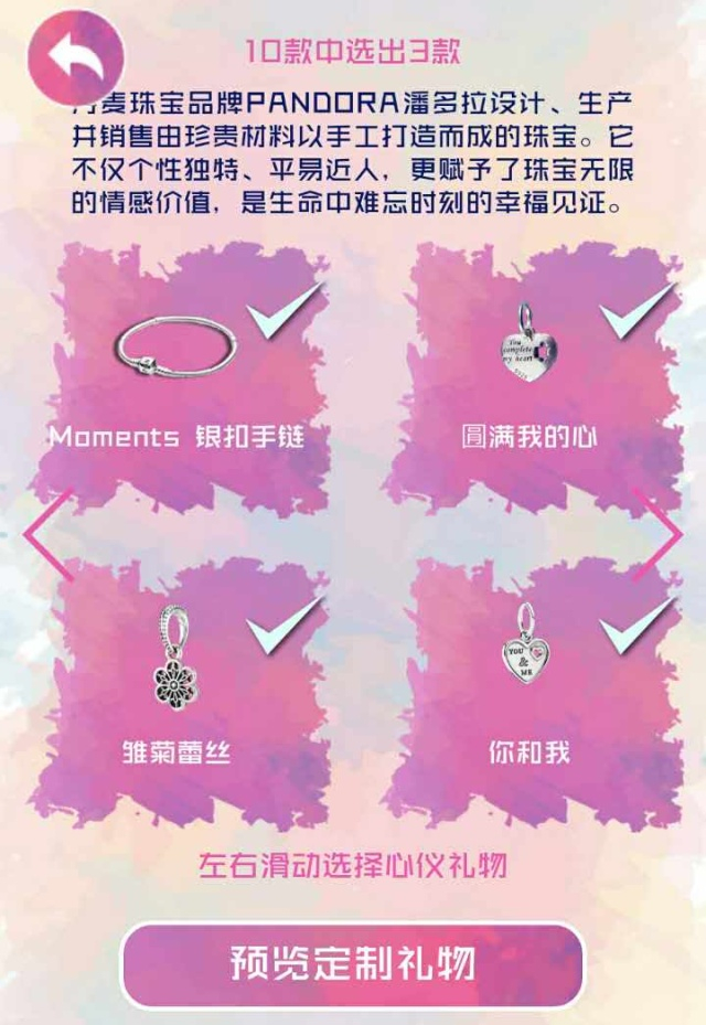 1. 进入游戏后,小伙伴可选择自己心仪的品牌进行定制。每一类我们都为大家准备了10款产品。除固定选项外,小伙伴还可任意选择3款进行搭配。同时也可以在“预览页面”查看你定制的产品,如果搭配不够喜欢,还可点击返回页面更换哦!