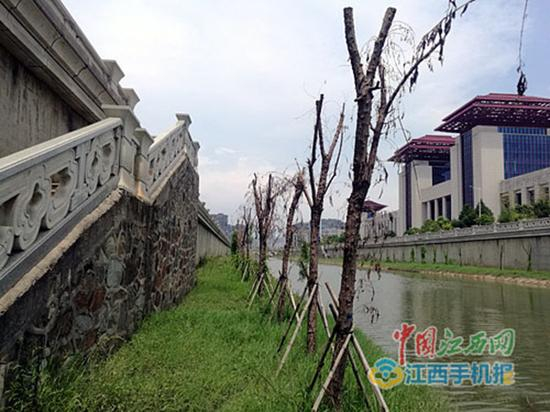 8月17日,南昌市民刘先生向中国江西网记者反映,南昌红谷南大道东方水系两侧栽种的景观树基本呈枯死状,数千米长的东方水系沿线新栽种树木绝大部分无枝叶生长。对此,红谷滩新区红角洲管理处城管办称,树苗枯死系上半年涨水浸泡所致,11月份是移栽季节,到时将对枯死树苗进行移种补栽。