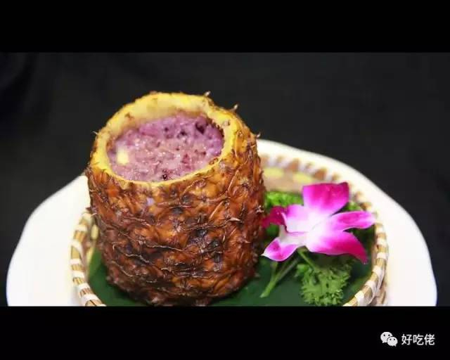 尝完了云南菜中的经典,接下来还有一道主食——菠萝饭,唱主角的当然就是菠萝了。有了滋味十足的菠萝加持,小小的菠萝饭自然不在话下。他们家的菠萝饭是将事先蒸好的糯米和黑米与菠萝肉混合在一起之后,加入适量的白糖,然后倒入菠萝盅里面,再丄炉蒸个几分钟就大功告成啦。