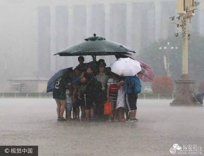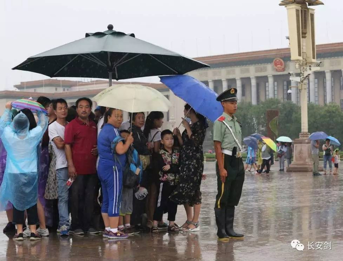 一张拍摄于天安门广场的照片在网上热传——突如其来的大雨中,天安门广场国旗区西南角,一柄深绿色哨位岗伞外,一名武警哨兵在雨中笔直伫立,身后伞下,挤满了来自天南地北的游客。