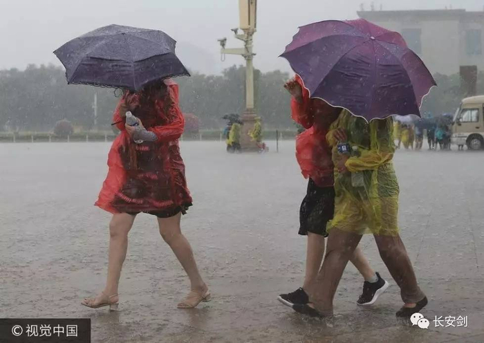(图:2017年8月18日,北京,游客冒雨游览天安门广场。当天北京遭遇暴雨天气,北京气象台拉响暴雨蓝色预警信号,提醒市民外出做好防范措施。供图:虎虎生风/视觉中国)