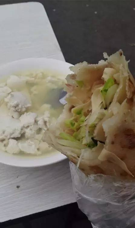 老豆腐没有什么作料,汤微微透着点儿咸味儿。看上去不好看,味道却非常醇厚,滴几滴辣椒油,就着卷饼,很是过瘾!