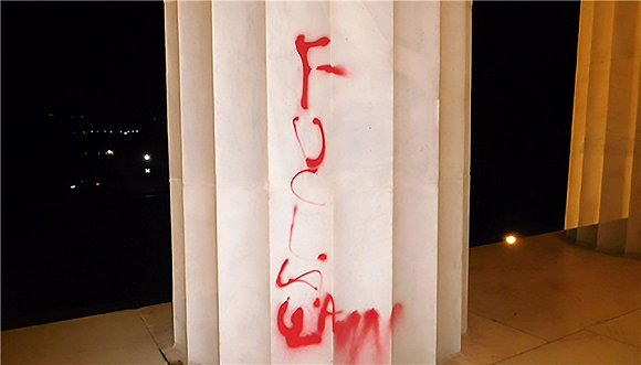 2017年8月15日,美国华盛顿,美国国家公园管理局证实,位于首都华盛顿的林肯纪念堂遭人涂鸦破坏。涂鸦看上去像是一句咒骂法律的脏话。来源:视觉中国