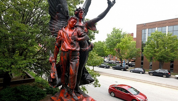2017年8月12日,美国巴尔的摩,邦联士兵与水手纪念碑的雕像被泼红漆。这是此前被该市考虑移除的纪念碑之一。图片来源:东方IC