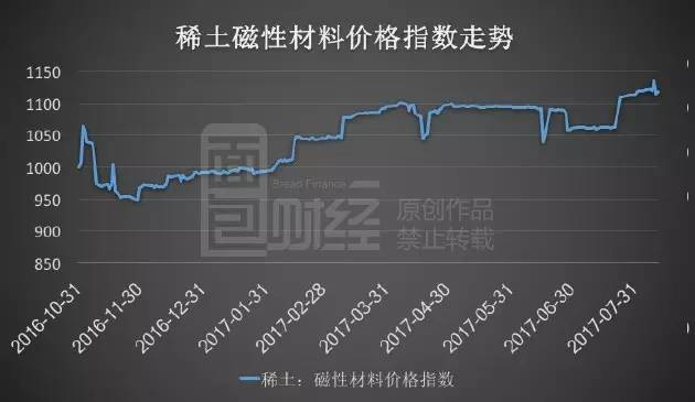 据华泰证券研报,以氧化镨钕、氧化铽为代表的稀土品种价格从2016年10月开始上涨,到今年7月底,主要稀土品种涨幅接近甚至超过50%。东北证券研报也称,今年以来,主要稀土价格涨幅在9%—35%之间,稀土价格自底部回弹。