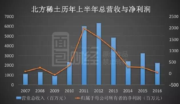 五矿稀土主要从事稀土分离业务,其并无稀土矿山采矿权,所需原材料需向外采购。而生产稀土原料,并且是中国乃至全球最大的稀土产品供应商——北方稀土,其业绩也很亮眼。北方稀土在业绩预告中称,今年上半年,净利润同比涨幅为230%—260%;上年同期,其净利润为3125.02万。下图为面包财经根据财报绘制的北方稀土历年上半年总营收与净利润: