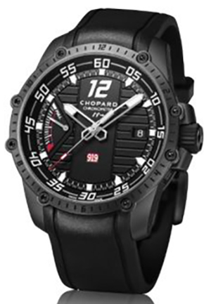 萧邦这枚特别版腕表,钛金属材质表壳经过哑光喷砂和黑色DLC处理。表圈则由8枚黑色PVD处理精钢螺丝固定,表带由酷似919赛车光滑轮胎的黑色橡胶制成。仿若转速表的分钟圈、轨道式刻度、小时时标、日期及动力存储显示,均采用白色装饰,与哑光黑色表盘形成鲜明对比。腕表搭载的L.U.C 01.11-M机芯配备氧化硅擒纵机构,振频高达57,500次/小时(8赫兹),这便是表盘上带有箭头图案的“H”字母的由来。