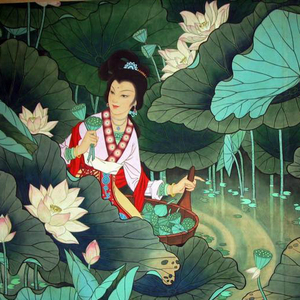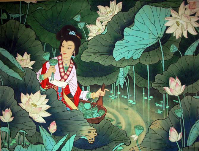 夏末秋初,姑娘摇船来到西洲,采集莲蓬。剥出青青的莲子,凝视着出神。这莲子纯净无暇,就像这青草沙中的清水。