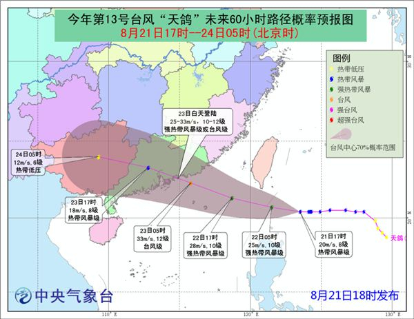 昨天下午,今年第13号台风“天鸽”生成(名字来源于日本,意义是天鸽星座)。今天下午5点钟位于台湾鹅銮鼻东偏南方约320公里的西北太平洋洋面上,预计,“天鸽”将以每小时20公里左右的速度向西偏北方向移动,强度逐渐加强,22日移入南海东北部海面,并将于23日白天在广东沿海登陆(25-33米/秒,10-12级,强热带风暴级或台风级),登陆后继续向偏西方向移动,强度逐渐减弱。