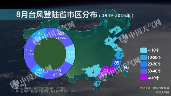 中国气象局公共气象服务中心气象分析师李宁分析,根据1981-2010年平均,常年8月在西北太平洋和南海上会生成5.73个台风(8级热带风暴或以上强度的热带气旋),为全年最多。每年8月平均有1.9个台风登陆我国,仅次于7月,全年第二多。不过纵观7-9月这三个月,每月平均登陆我国的台风个数都比较接近,由此可见通常每年7-9月,是台风影响我国的集中时期。