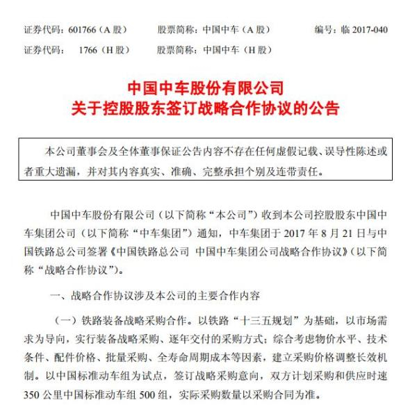 8月21日,中国铁路总公司(下简称“中铁总”)与中国中车集团公司在北京签署战略合作协议。其中,在铁路装备战略采购合作方面,以中国标准动车组(又名“复兴号”)为试点,签订了战略采购意向,双方计划采购和供应时速350公里中国标准动车组500组。