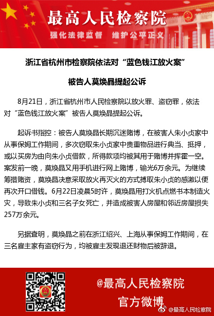 8月21日,浙江省杭州市人民检察院以放火罪、盗窃罪,依法对“蓝色钱江放火案”被告人莫焕晶提起公诉。