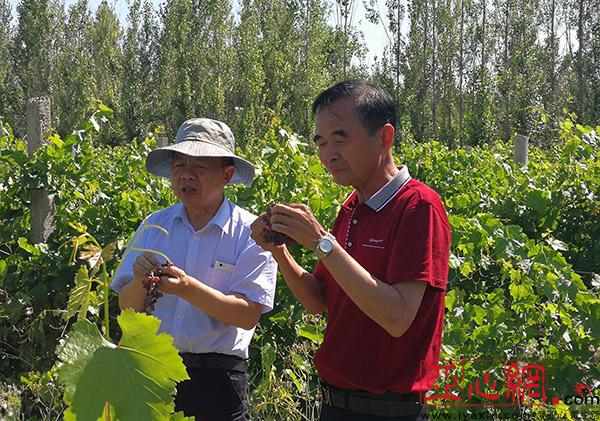 新林木业董事长赵明(右一)与新疆鑫泰投资集团总经理谢文广(右二)考察新林木业林木基地,了解投资建设环保型纸浆企业的可能性。