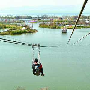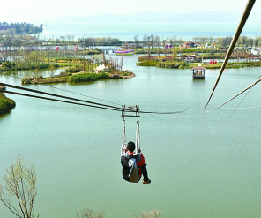 游客乘观光溜索观赏滇池古滇湿地风景。新华社发