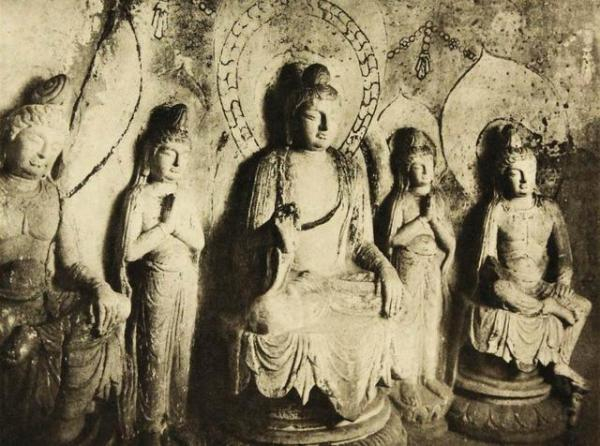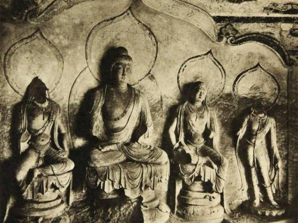 第十八窟东壁佛与左右胁侍三菩萨(历史图片 《天龙山石窟》1922年出版 摄影:平田饶)