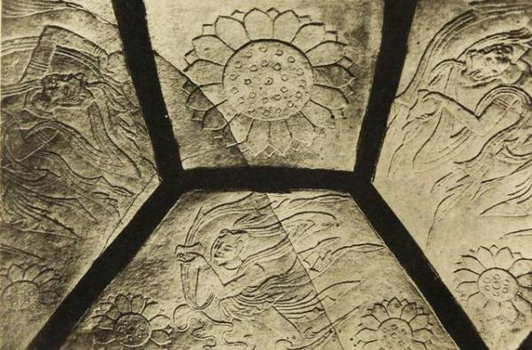 第二窟内天井中央莲花及南方供养飞天(历史图片 《天龙山石窟》1922年出版 摄影:平田饶)