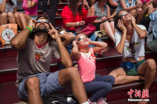 此次日食也为科学家探索太阳、地球、月球及其相互作用奥秘提供了机会,很多科学家借此开展相关研究,仅NASA就动用了11架航天器、50多个高空气球以及众多地面观测站进行多点观测。图为众多民众聚集在时报广场观看日食。 中新社记者 廖攀 摄