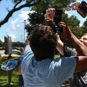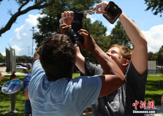 当地时间8月21日,美国迎来罕见日食景观。图为休斯敦太空中心独立广场上,游客将日食眼镜挡在镜头前拍摄日食景观。 中新社记者 曾静宁 摄