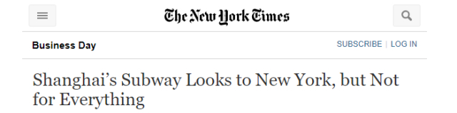 美国《纽约时报》网站近日刊登题为《借鉴纽约经验,上海地铁青出于蓝》的报道,将上海地铁和纽约地铁放上PK台,上海表示纽约有一套现代化公共交通系统,“但我们不想完全复制。”美国虽然是最早拥有地铁的发达国家之一,但纽约的地铁系统颠覆了外界对美国的“先进”印象,其如今堪称是全球最大、也是最脏乱的地下铁路系统之一。