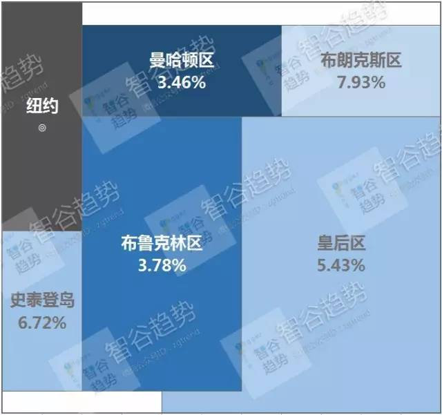 城市中每个区域的租金回报率也不一样,拿纽约和北京作对比: