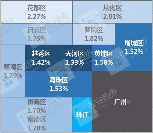 ② 广州市:与纽约的分布情况相似,越中心租金回报率越低。