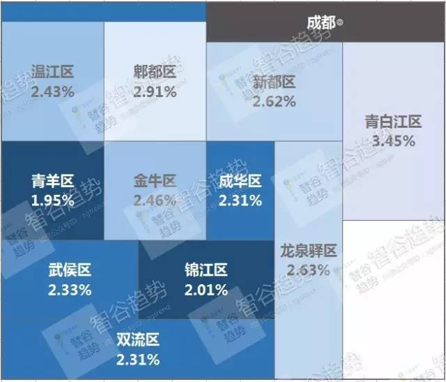 成都也是租金回报率较高的城市,并且它的呈现也相对均匀,跟上海、重庆相似。同时,它也呈现出越市中心租金回报率越低的现象。就我们统计,锦江区和青羊区是成都房价最高的两个区,他们的租金回报率也自然是最低的了。
